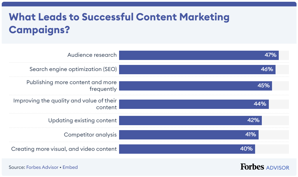 According to data gathered by Forbes in 2024, audience research is the leading factor that contributes to the success of content marketing campaigns. Simply put, you have to know what your audience is looking for and provide it.