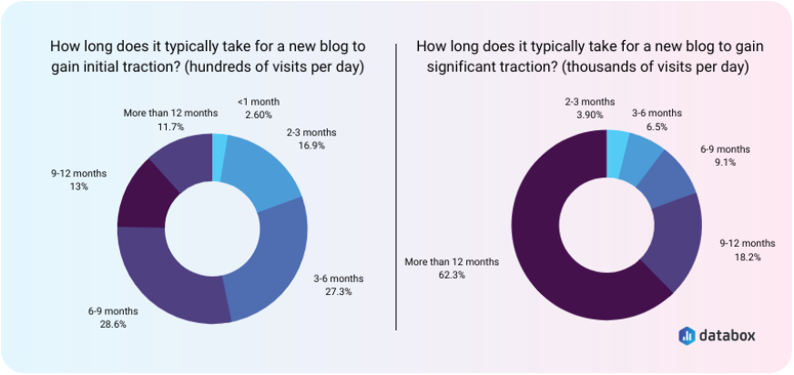 Creating a successful blog is a marathon, not a sprint. According to research from Databox, over 55% of marketing experts surveyed agreed that a new blog will take about 3-9 months to start gaining traction online.