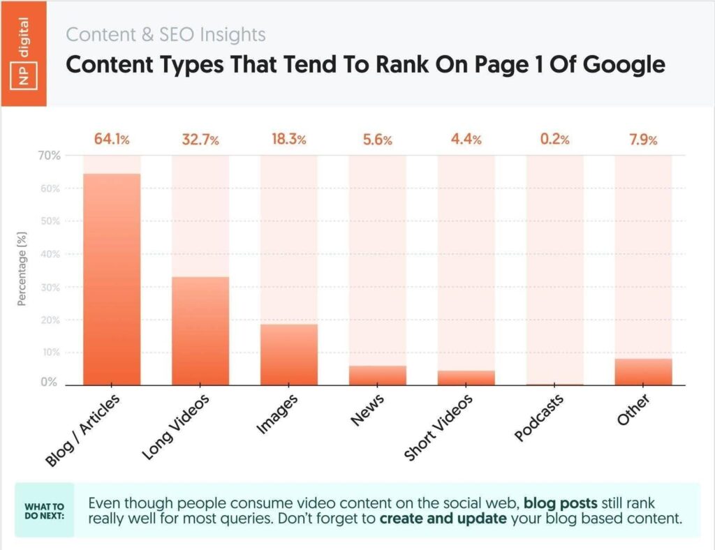 Let’s look at the numbers. According to a study from Neil Patel in 2025 that analyzed over 11 million search queries, blog articles make up 64% of all content that ranks on page one of Google. That means when someone searches for information online, Google overwhelmingly favors blogs over everything else.